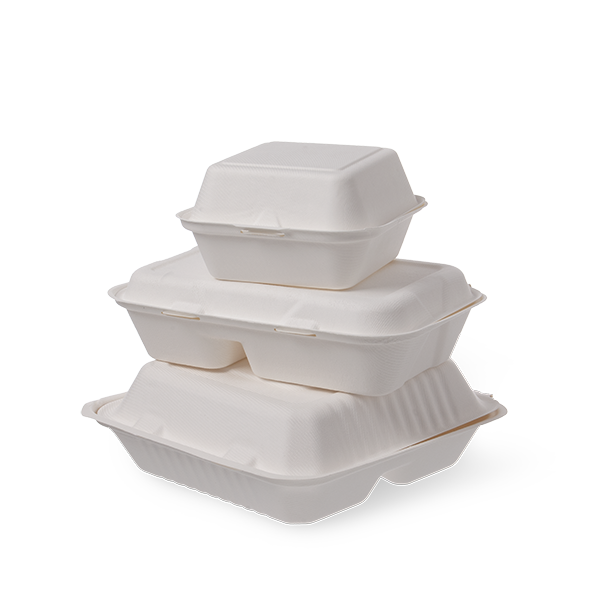 Menüboxen, Lunchboxen und Hamburgerboxen aus natürlicher Bagasse. Geeignet für warmes Befüllen, Mikrowelle und Kühlschrank. Bagasse ist auf natürliche Weise fett- und feuchtigkeitsbeständig.