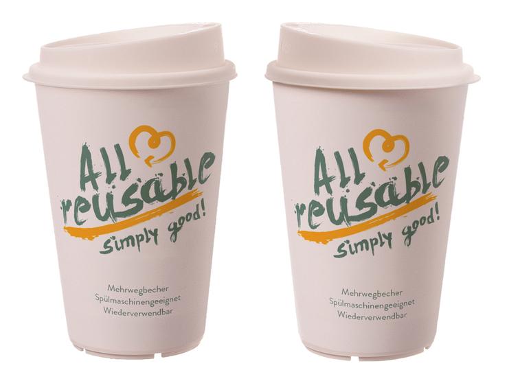 Unser ALL REUSABLE Becher ist die umweltfreundliche Mehrweglösung für Ihr Coffee-to-go Geschäft. Der Mehrwegbecher ist in drei verschiedenen Größen erhältlich und dank Eichstrich auch für Kaltgetränke geeignet. Gerne bieten wir Ihnen auch individuell bedruckte Becher an.