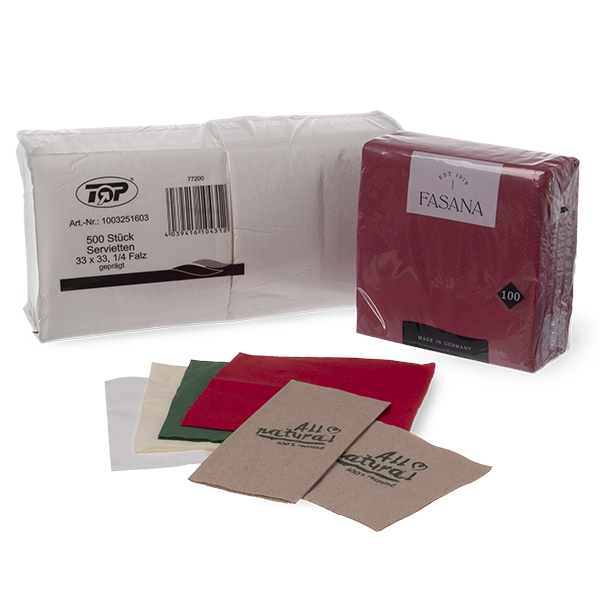 Hygienisch und nachhaltig: Wählen Sie aus einer großen Auswahl die optimale Serviette für Ihr Lokal. Nutzen Sie Servietten als Ihren Werbeträger!